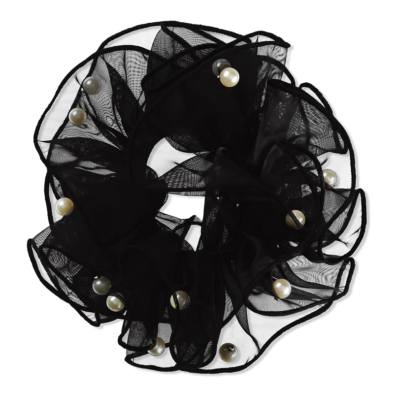 VDAY BLACK SCRUNCHIE W PEARL. Features: Scrunchie adds airy, romantic texture. Faux pearl accents add a touch of glam. Comfortable, all-day hold. Perfect for everyday styling or special moments. : :