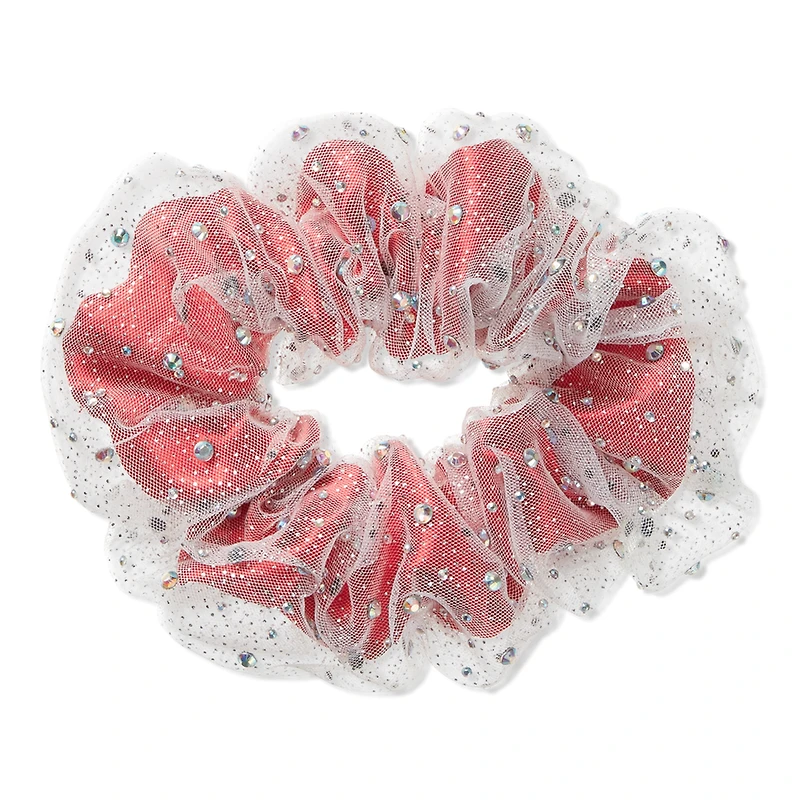 HOLIDAY 25 RED SCRUNCHIE IN SCRUNCHIE. Features: 2-layered scnci scrunchie has standout dimension. Classic red scrunchie wrapped in sparkly silver tulle. Rhinestones add festive glitz and shine. Soft, gentle holdno snags or breakage. Perfect for holiday parties or winter glam. Easy way to dress up any pony or bun. : :