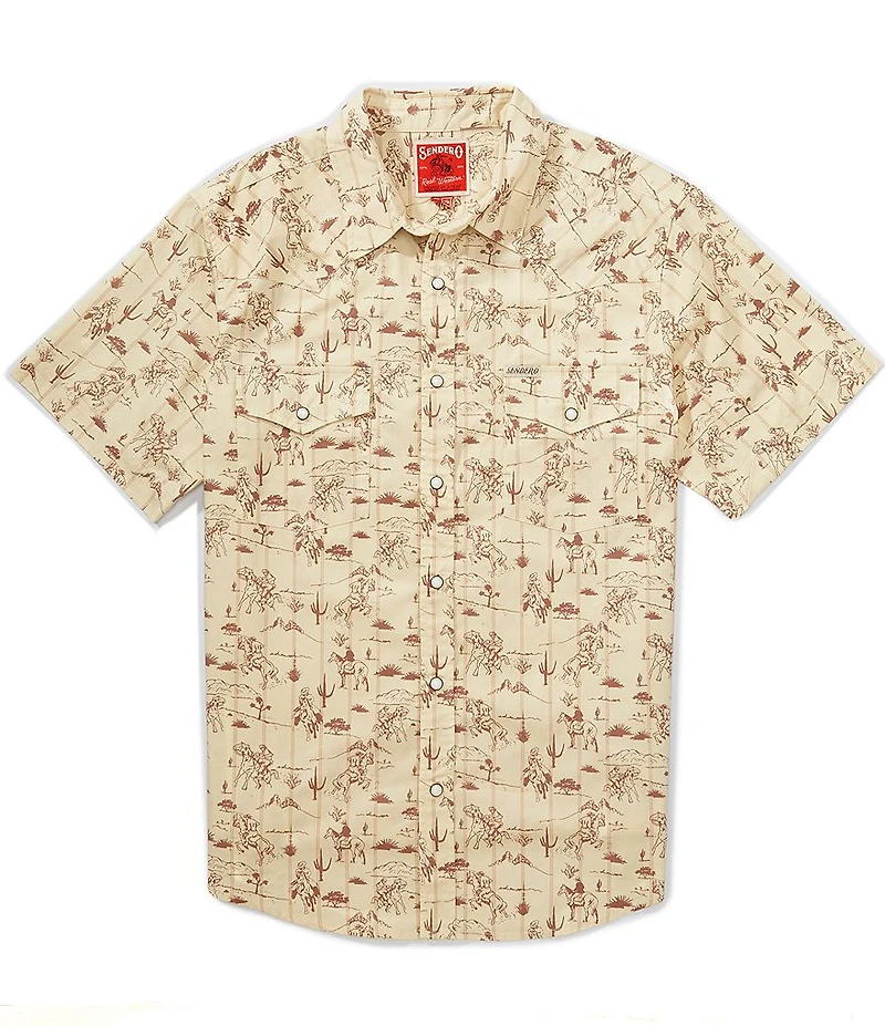 From Sendero Provisions Co., this shirt features: Western print Point collar Short sleeves Pearl snap-front closure Snap flap front pockets Cotton Machine wash/tumble dry Imported.