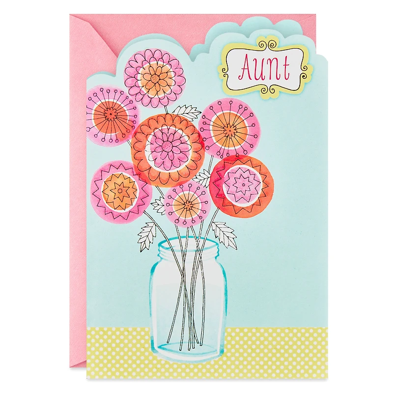 Mother's Day greeting card for aunt features a pretty pink and orange illustration of modern flowers in a vase with a die-cut top edge and glitter accents paired with a joyful message.