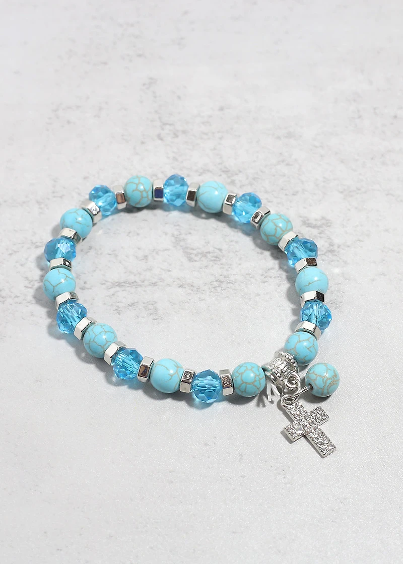 Elevate your accessory game with this elegant cross charm marbled beaded bracelet—a perfect blend of faith, fashion, and timeless design. This stretch bracelet brings a touch of sophistication to any outfit. Each bead is separated by sleek silver-tone spacers, adding a modern edge to the classic beaded look.