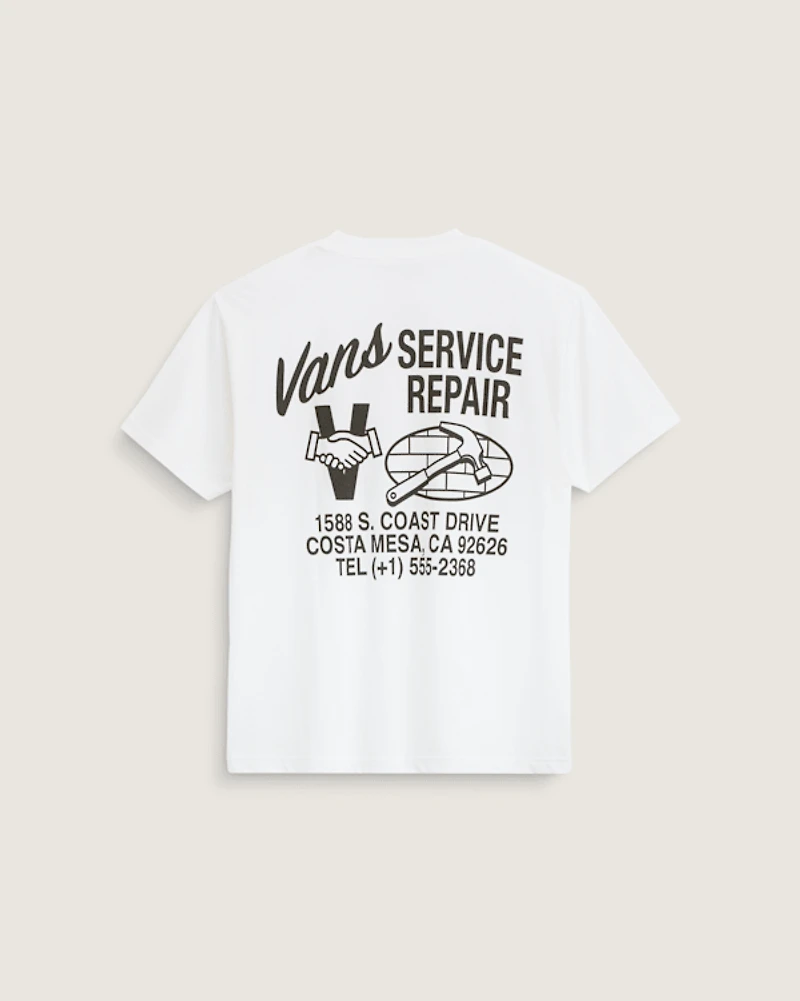 Fix your fashion with the Service Repair T-Shirt, featuring short sleeves for a casual, everyday style. Screen print artwork for a long-lasting design points to a fictional repair shop at the address for Vans HQ.