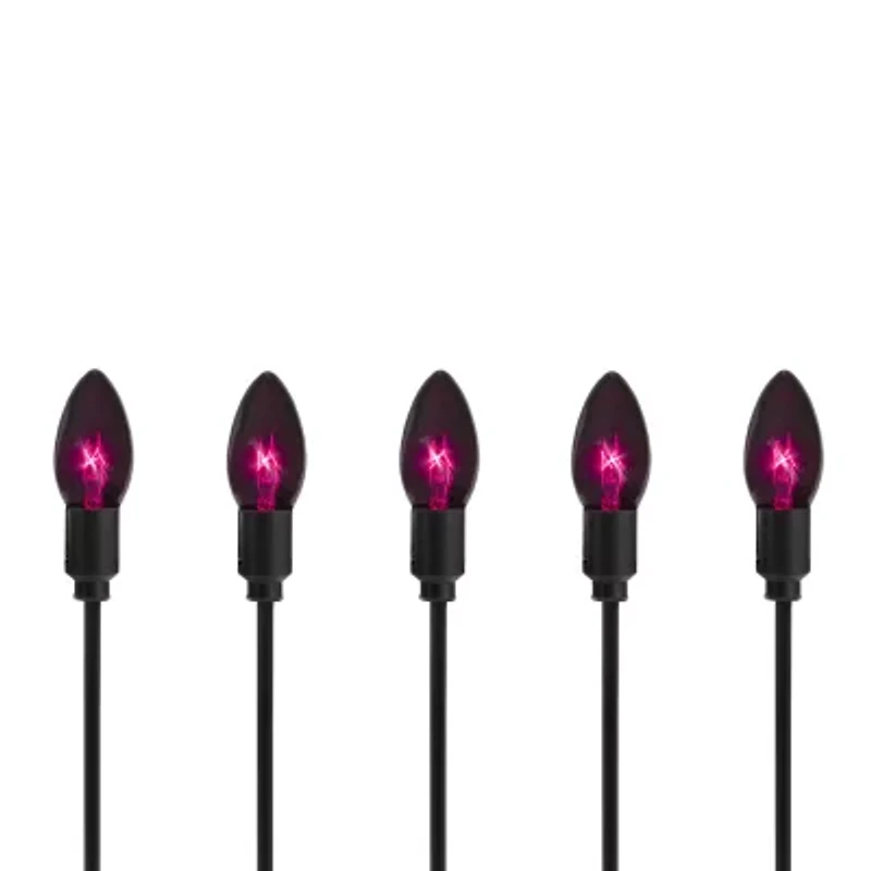 It's the spookiest time of the year. Make sure your Halloween decorations are the talk of the neighborhood this year. These purple pathway markers are perfect for leading trick-or-treaters to your front door. Product Features: Color: transparent purple bulbs/black wire. Total number of bulbs: 10. Bulb size: C9. Bulb type: incandescent. Spacing between each bulb: 11". Lighted length: 8.75'. Total length: 10'. 5.5" black lead cord. 6.5" tail cord. Additional Product Features: Comes with black ground stakes and husks. Light assembly required. 8" ground stakes. UL certified and approved for indoor or outdoor use. Contains 1 plug with end connector which allows you to stack multiple lighted items together (210-watt max). Wire gauge: 20. 120 volts 60 hertz 0.58 amps 70 watts. Dimensions: 14" high with ground stakes and husks (approximately). C9 bulbs: 2" high x 1.25" diameter. Material(s): plastic/glass bulbs/wire. Note: Lights are attached and cannot be used separately