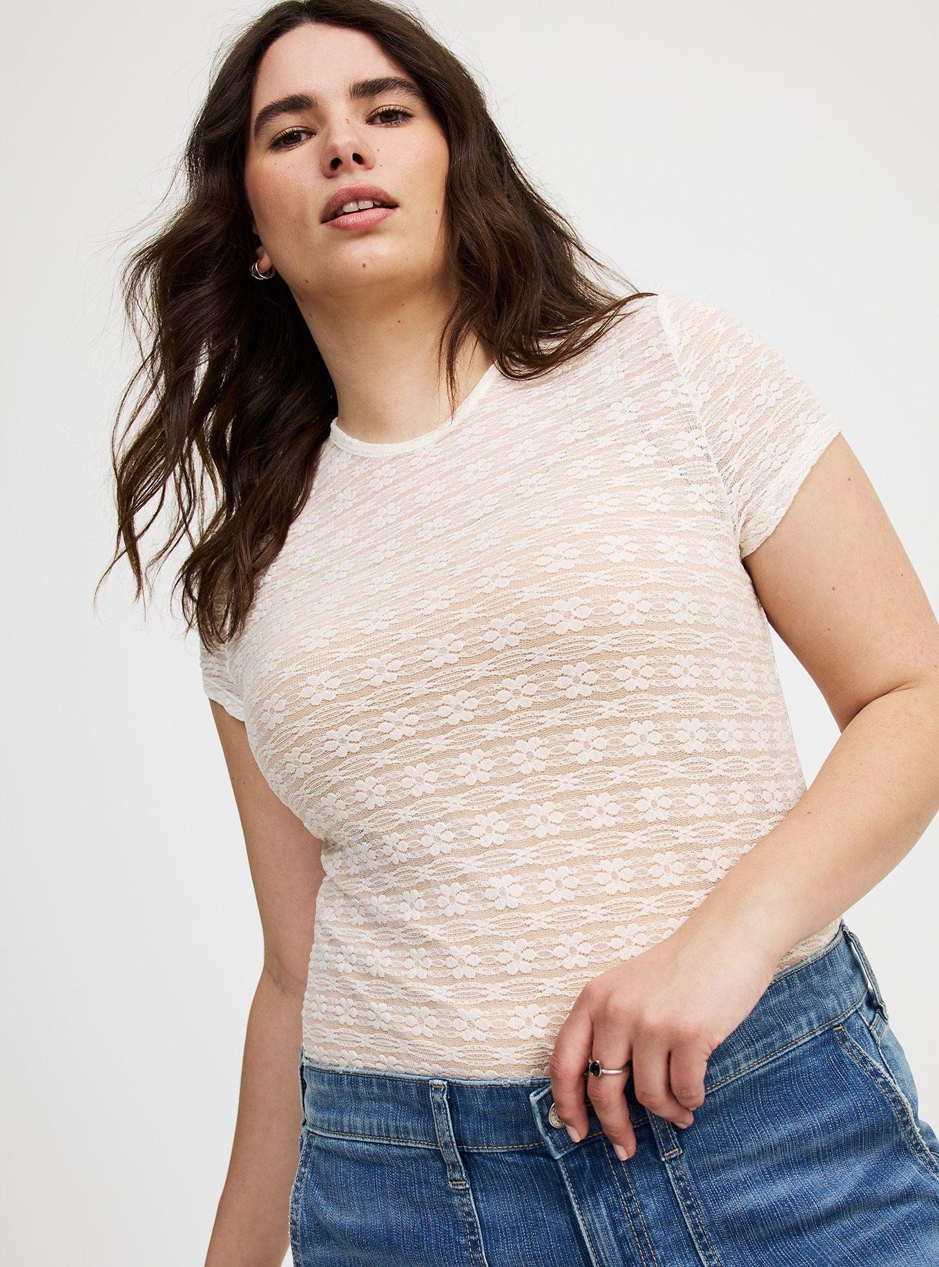 FIT Measures 28'' from shoulder (size 2). MATERIALS + CARE Sheer daisy stretch lace knit fabric. 92% nylon, 8% spandex. Wash cold. Tumble dry low. Imported. DETAILS Crew neck. Short sleeves. Unlined, sheer.