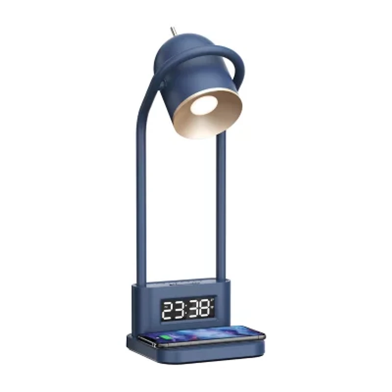 Fun and functional, the Newport lamp by Sheffield labs combines an array of space-saving features in a striking vintage-inspired design. A capacitive touch-sensing switch mounted on the pivoting lamp head controls the led light source's multiple brightness levels and color temperatures with the tap of a finger. The solid metal frame secures the pivot joints on either side while acting as a handle when moving the lamp. Integrated into the lamp base is a fully dimmable lcd containing a 12/24-hour clock with dual alarm modes and customizable snooze settings. Rounding out the lamp's functions, a qi-certified wireless charging pad and rear usb type-a charging port enable simultaneous charging for any two compatible devices while you work. Seamlessly blending into your bedside or desktop workstation setting, the Sheffield labs Newport lamp is perfect for any job, providing optimum productivity with minimum distraction.