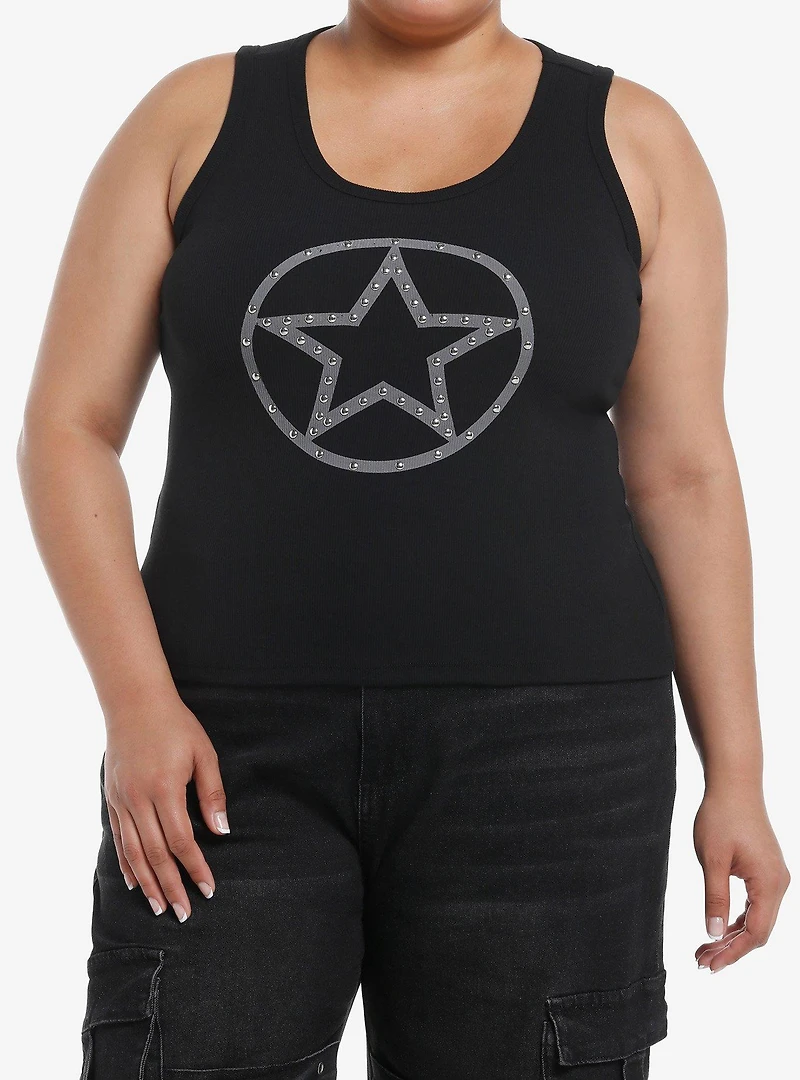 We're calling all baddies to the wild west! This black, ribbed tank top features a grey sheriff star design printed on the front with silver-tone stud accents.