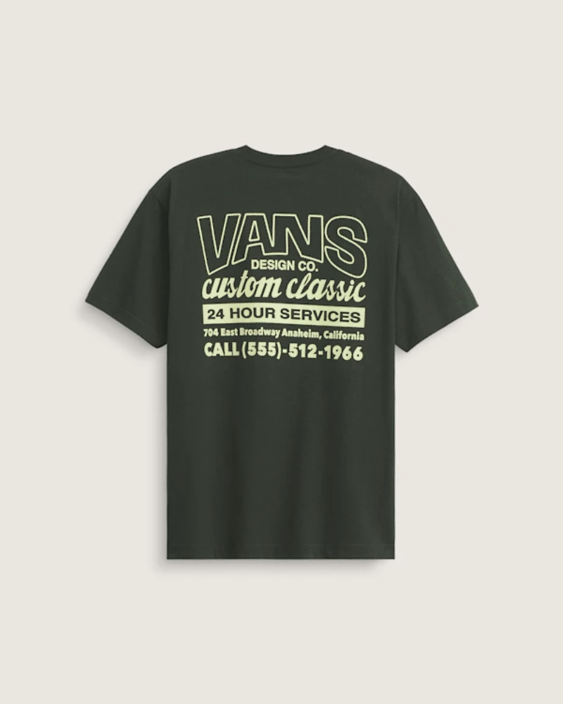 Wear a piece of Vans history in the Shop Front T-Shirt, paying homage to the company's first factory. This classic fit short sleeve crew neck T-shirt features a Screenprinted graphic of a Vans® logo on the front, with a retro storefront ad of the factory's address on the back.