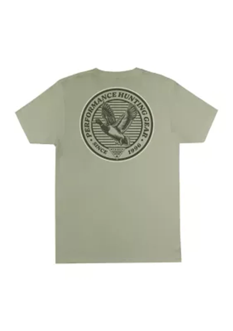 A hunting-inspired graphic adds outdoorsy appeal to this short-sleeved t-shirt from Columbia. Pullover Crewneck Short sleeves Imported Material & Care Cotton, polyester blend Machine washable