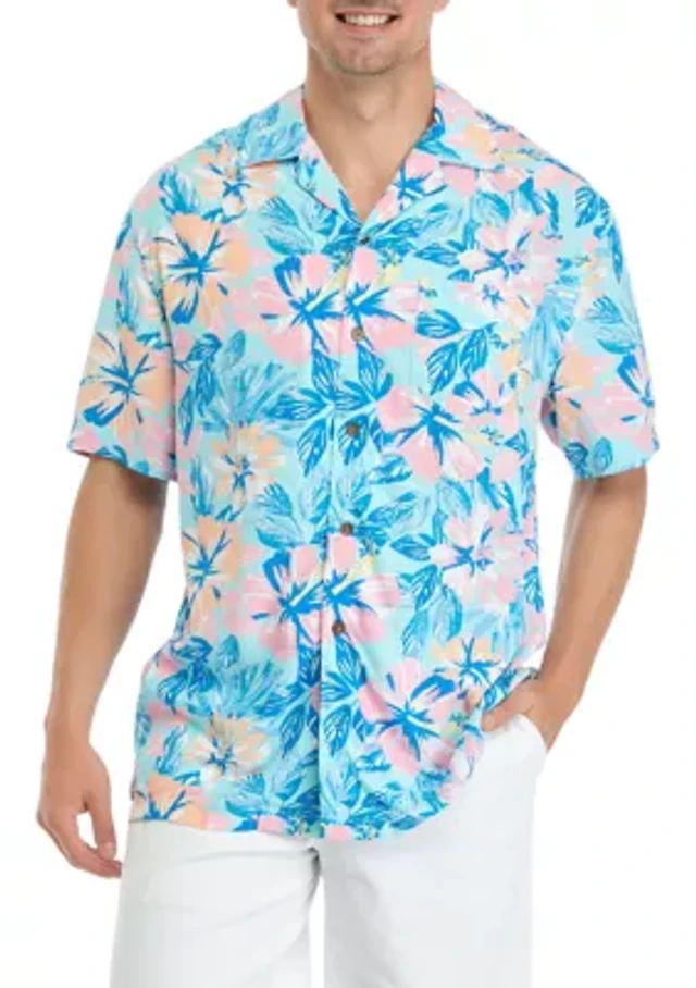 Caribbean Tropical Floral Print Short Sleeve Woven Camp Shirt
