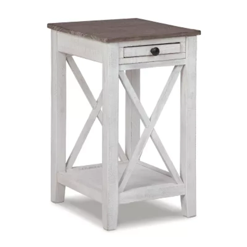 Modern meets vintage in this accent table. Made of woods in a distressed white and gray finish, the crossbuck supports on two sides create a vintage vibe. With two usb charging ports, the accent table also adds modern function. The storage shelf and drawer make this piece a must-have for your living space.