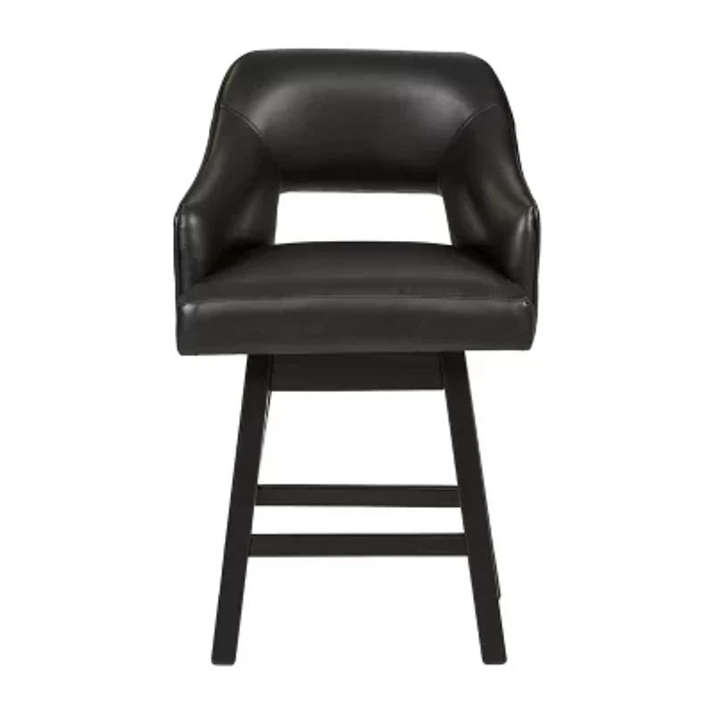This striking barstool invites you to take contemporary modern style for a spin. Comfortably cushioned seat, self-returning swivel and contoured back make it beautifully in tune with your needs. Luxurious faux leather upholstery is a sensational touch.
