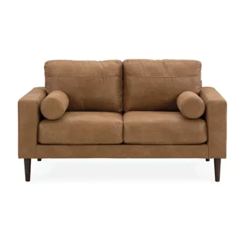 Small-scale style, tailored to perfection. This loveseat echoes retro aesthetics with warm caramel faux leather, while its ultra-linear silhouette incorporates a contemporary edge. Versatile in form and function, the seat suits styles from modern boho to transitional. And its size helps you to confidently curate your compact space without sacrificing comfort (or your budget).