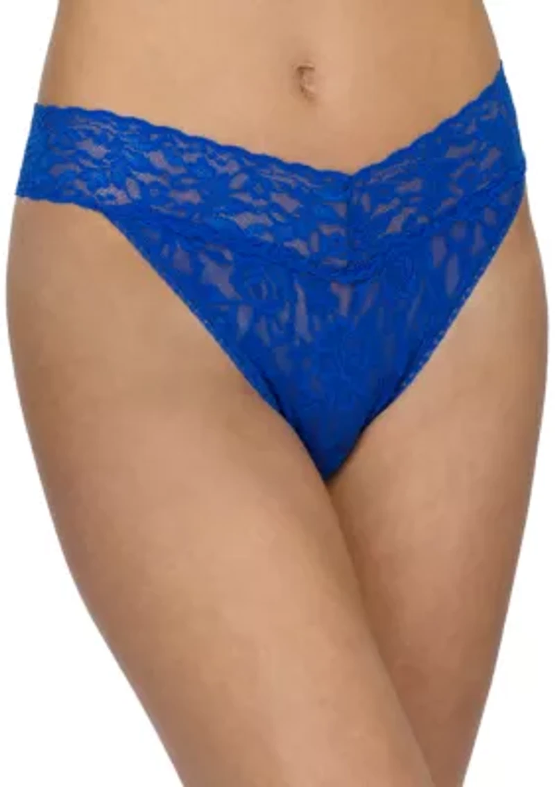 Stitched with floral stretchy lace, this one-size thong by Hanky Panky® fits sizes 4-14 best. This thong also sits higher on the hips. Imported Material & Care Lace Nylon Hand wash