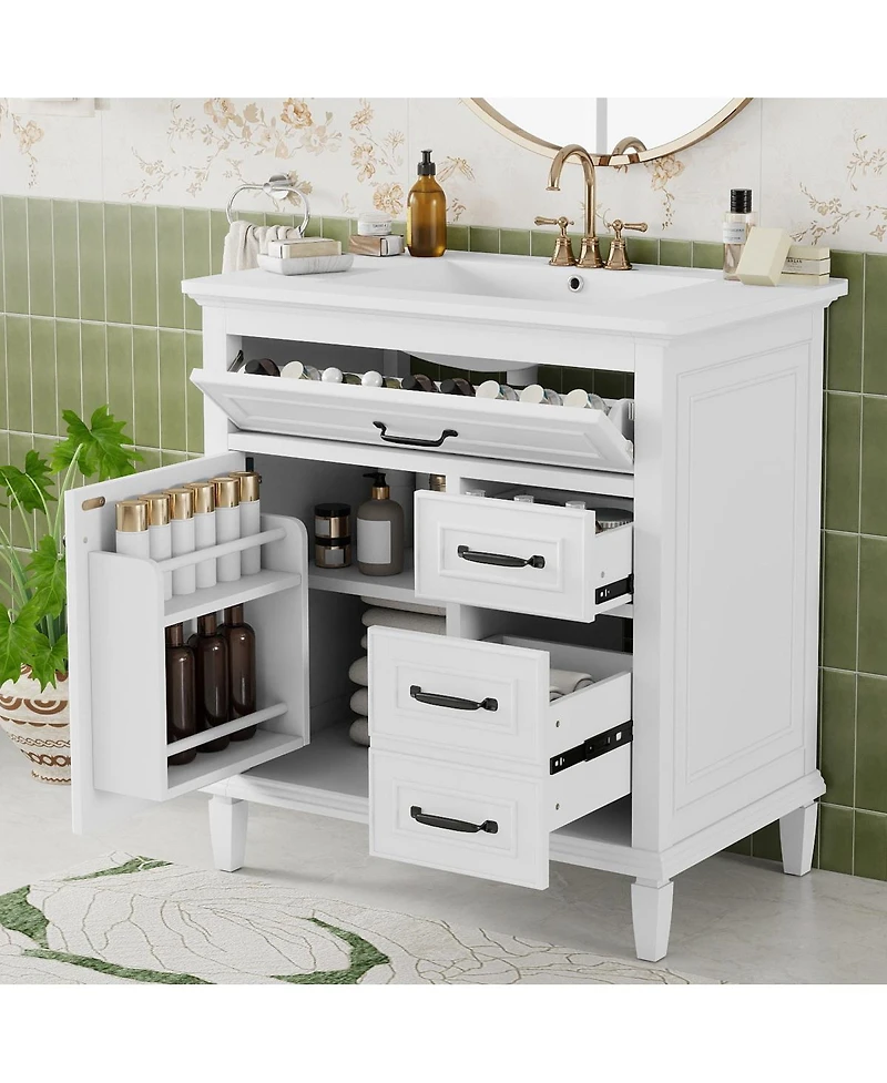 Transform your bathroom with this modern vanity, crafted for style and endurance. The solid wood frame and Mdf structure deliver reliable stability, while the smooth ceramic sink top provides a sleek, easy-to-clean surface. Thoughtful storage includes three drawers—one flip-style—and a soft-close cabinet door, keeping essentials organized and accessible. An adjustable shelf, polished hardware, and a freestanding design make it versatile for any bathroom layout. Elevate your daily routine with soft-close door hinges for added comfort and a built-in rack for extra storage inside the door. This vanity combines timeless elegance with everyday function, making it the perfect centerpiece for your bathroom makeover.