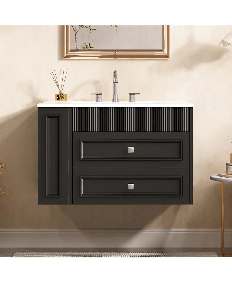 Upgrade your bathroom with this 30-inch wall mounted vanity, thoughtfully designed to save space while adding modern flair. The floating construction not only offers a contemporary look but also makes cleaning underneath effortless. Built from durable Mdf, this vanity ensures stability and longevity for everyday use.Enjoy flexible storage with two spacious soft-close drawers and an open shelf on one side, perfect for keeping towels, toiletries, and daily essentials within easy reach. The integrated ceramic sink features a smooth, high-gloss surface that is resistant to stains and simple to maintain. Elegant hardware and clean cabinet lines showcase quality craftsmanship and minimalist style. Ideal for compact bathrooms, this vanity brings practical organization and refined elegance to your space.