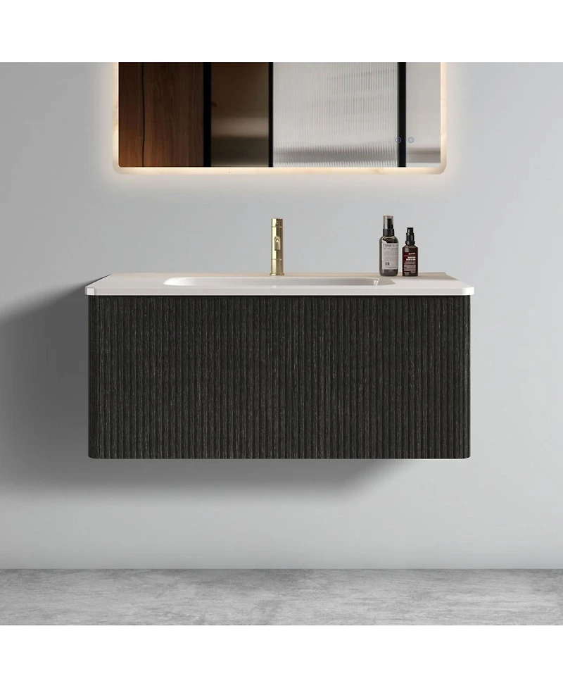 Elevate your bathroom with a floating vanity that merges modern design, durable materials, and everyday practicality. Crafted from premium melamine board, this vanity is highly resistant to moisture, scratches, and daily wear, maintaining its beauty even in humid environments. The integrated ceramic sink delivers a seamless, glossy finish that s easy to clean and always shines. The vanity s striped texture creates a sophisticated, on-trend look, while elegantly curved edges offer enhanced safety and a soft, contemporary silhouette.Enjoy smooth, handle-free access to your essentials with the push-open drawer, perfectly sized for towels, toiletries, and more. The clever U-shaped storage design maximizes every inch, wrapping around plumbing to keep your space tidy and organized. With its generous drawer height and wall-mounted style, this vanity opens up your bathroom, making it feel both spacious and luxurious. It s the ideal upgrade for those who value both function and style.