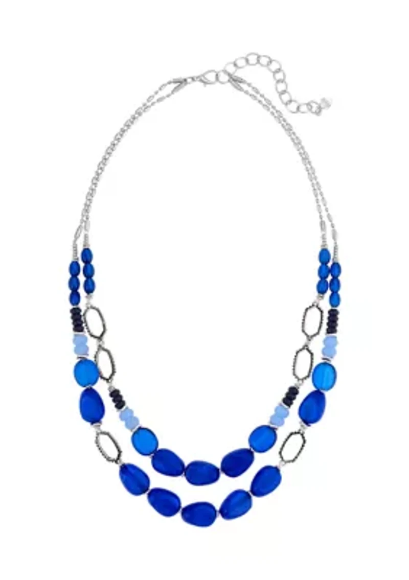 Silver Blue Beaded Two Row Short Necklace