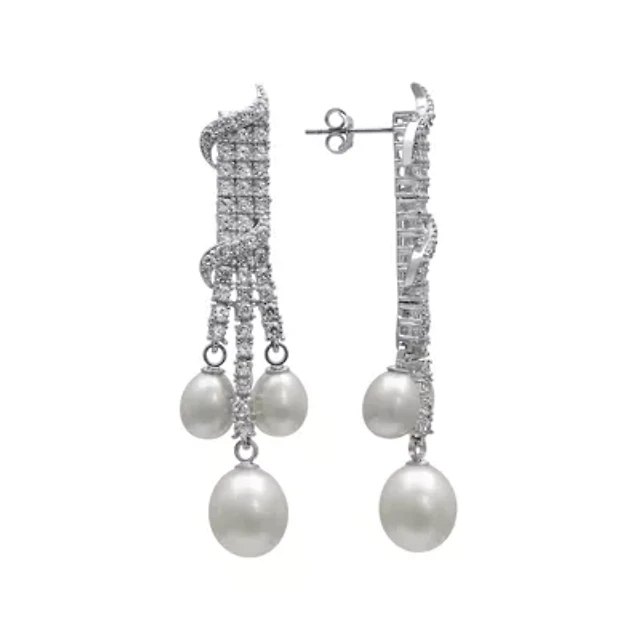 Cultured Freshwater Pearl (6-6-1/2mm) & Cubic Zirconia Double Chain Drop Earrings Sterling Silver (Also 18kt Gold over Silver)