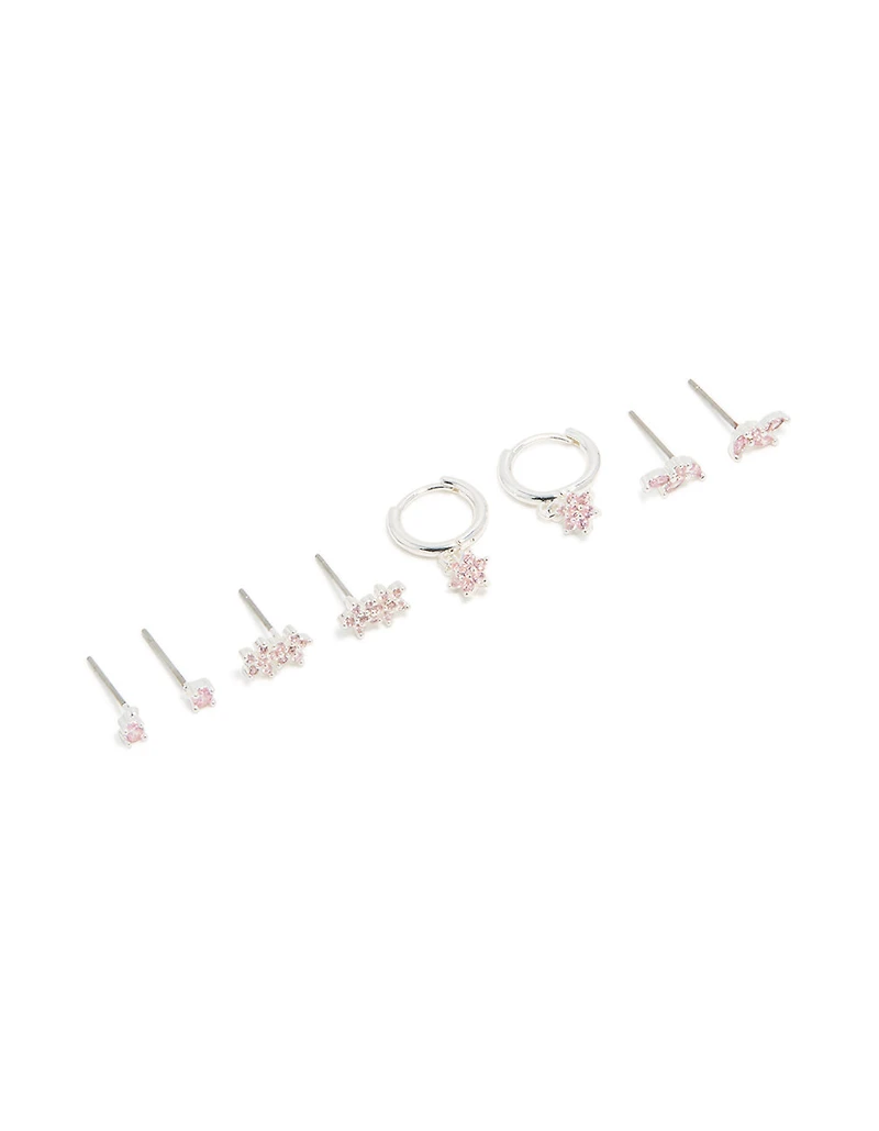 Silver Plated Brass Pink Cubic Zirconia Flower Stud & Hoop Earrings 4-PackSilver Plated Brass Pink Cubic Zirconia Flower Stud & Hoop Earrings 4-PackSilver Plated Brass Pink Cubic Zirconia Flower Stud & Hoop Earrings 4-Pack