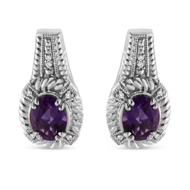 Silver 9x7mm Oval Purple Amethyst and Diamond Accent Fashion Drop Pendant Necklace