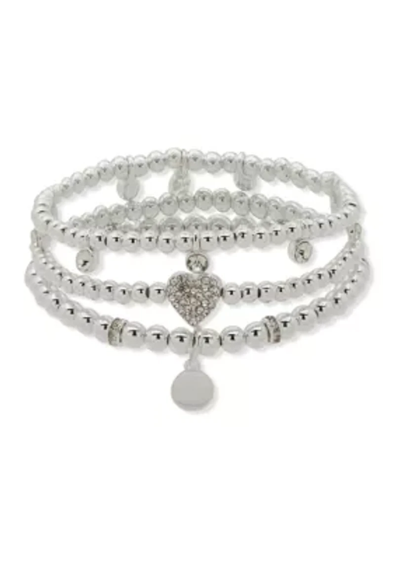 Adorn your wrist with this elegant set of three bracelets from Nine West, designed to effortlessly elevate any outfit. Crafted from polished silver-tone metal, these stackable, stretch bracelets feature delicate crystal pave heart accents that shimmer with every movement. Set of 3 Slip-on Polished finish Imported Material & Care Silver-tone metal Clean with a soft cloth