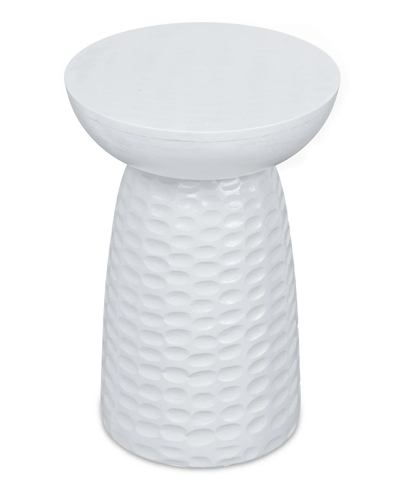 The Boyd Mango Wood Accent Table's sleek white finish highlights the mango wood, while the hand-carved texture adds a contemporary touch. Ideal for living rooms, bedrooms, family rooms, or basements.