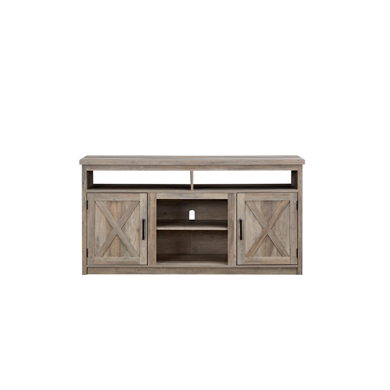 Classic farmhouse Tv stand with 60" width and space for up to 65" TVs. Features cable management, open and closed storage, and elegant grey wash wood grain finish.