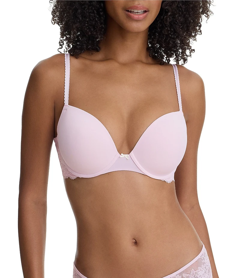 From Skarlett Blue, this bra features: Full coverage T-shirt bra with stretch foam cups Smooth matte jersey fabric disappears under clothing Plunge neckline creates a flattering, low-cut silhouette Floral lace frames at the sides Fully adjustable shiny straps with scalloped edges Hook & eye back closure Polyester/nylon/elastane Hand wash Imported.