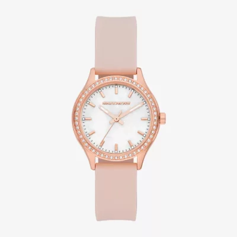 This casually dressy Skechers Starline three-hand watch features a rose gold tone metal case with glitz bezel, genuine mother of pearl dial and soft solid blush silicone strap.