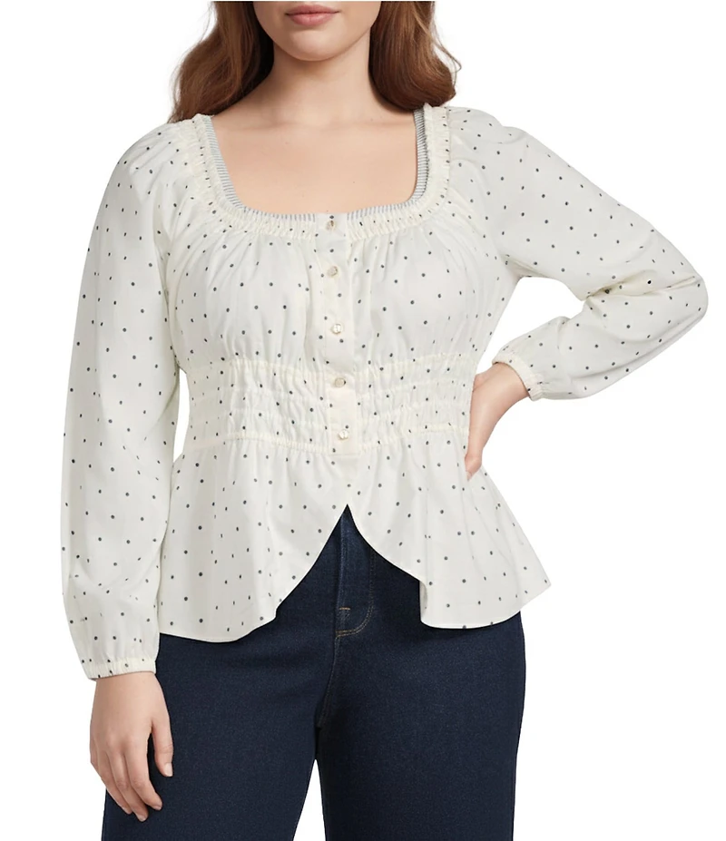 From Skies Are Blue Plus, this top features: Polka dot print Square neckline Long sleeves Pullover construction Smocked waist detail Elastic at waist and sleeve opening Front button detail Peplum hemline Approx. 27.5" length Cotton Hand wash Imported.