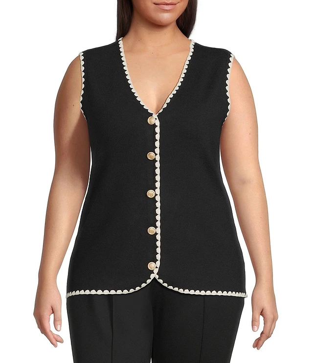 Skies Are Blue Plus Size Whip stitched Scalloped Edge Sleeveless Sweater Knit Vest