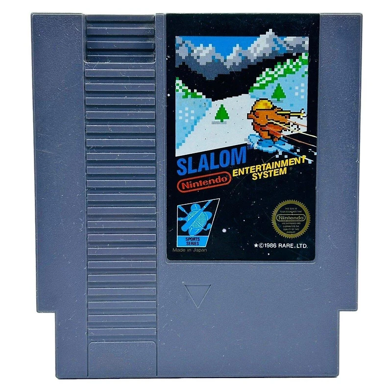 Slalom is a fast downhill skiing game from Rare, featuring obstacle‑filled slopes, tight turns, and increasing difficulty. Race against the clock while navigating moguls, trees, and other skiers in this early but impressive NES sports title.