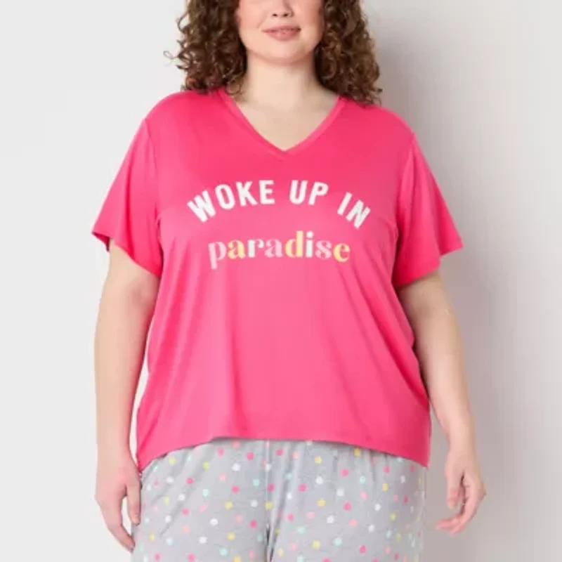 This women's plus graphic pajama top from Sleep Chic is perfect for lounging or a peaceful night's sleep. It is made from a soft stretch-jersey with a v-neckline, short sleeves and an empowering graphic slogan. Pair it with pajama shorts or pants.