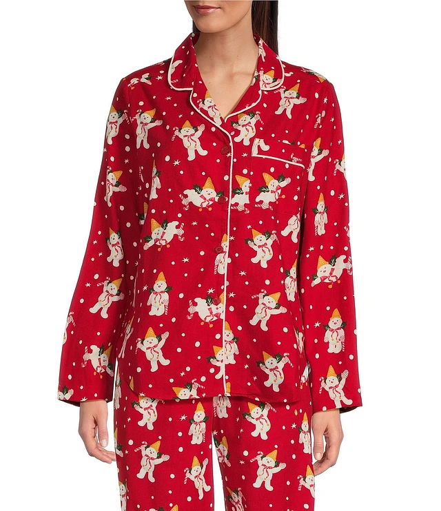 Sleep Sense Mr. Bingle Print Flannel Long Sleeve Notch Collar Coordinating Button-Front Holiday Sleep Top