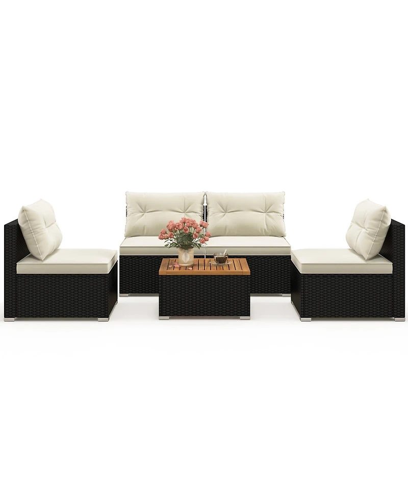 Elegant Rattan Set: All the 5 pieces of this patio rattan set are wrapped with premium black Pe rattan which is well-woven and anti-fading, ensuring prolonged outdoor using time. And the rattan surface also makes the whole set more elegant. The 4 armless sofas are equipped with soft cushions featuring high-density fillings for more comfort, making you more relaxed. Moreover, the smooth zippers of seat cushions make the covers easy to detach and maintain.