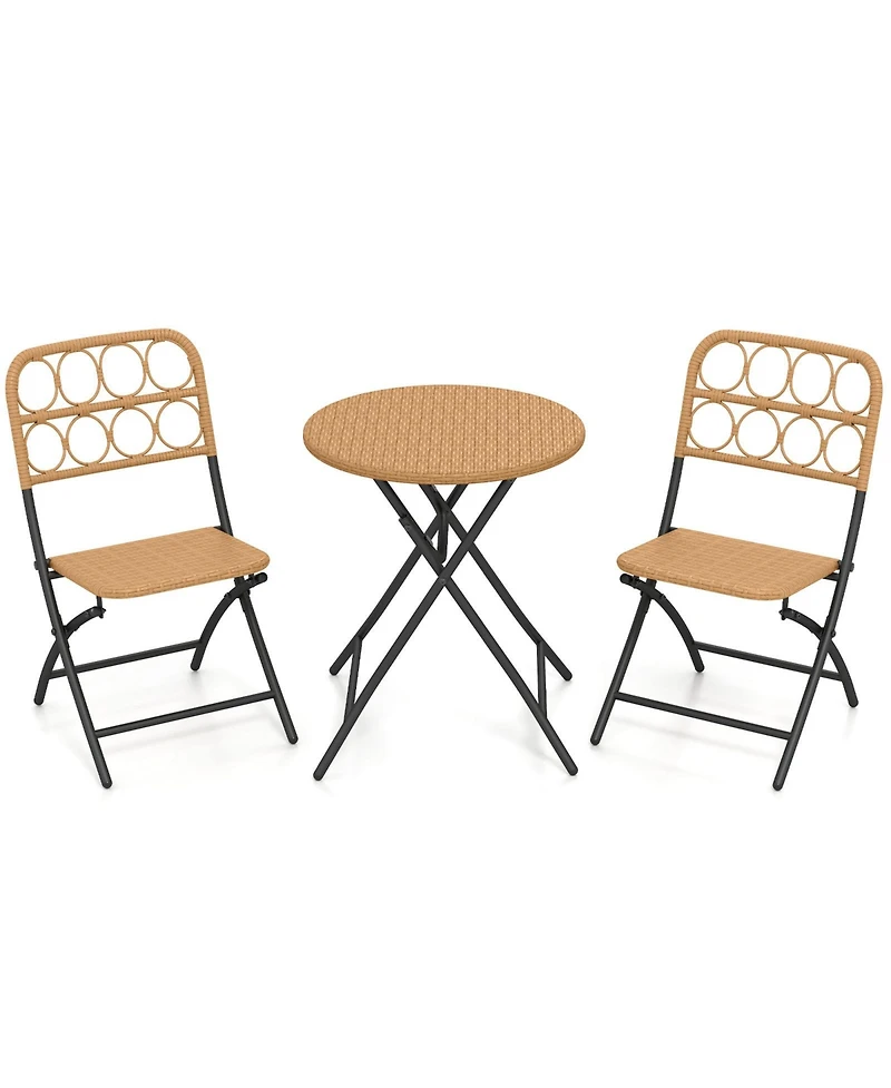 Add flexible seating to your outdoor space with this 3 Piece Patio Bistro Set featuring a folding round table and two matching chairs with woven wicker seats. Designed for easy setup and storage, the folding construction makes it ideal for balconies, patios, and small outdoor areas. The round tabletop provides a convenient surface for drinks, snacks, or casual meals, while the contoured wicker seats offer comfortable support. Built with a sturdy frame for reliable everyday use, this compact bistro set blends function and style for relaxed outdoor dining and lounging.