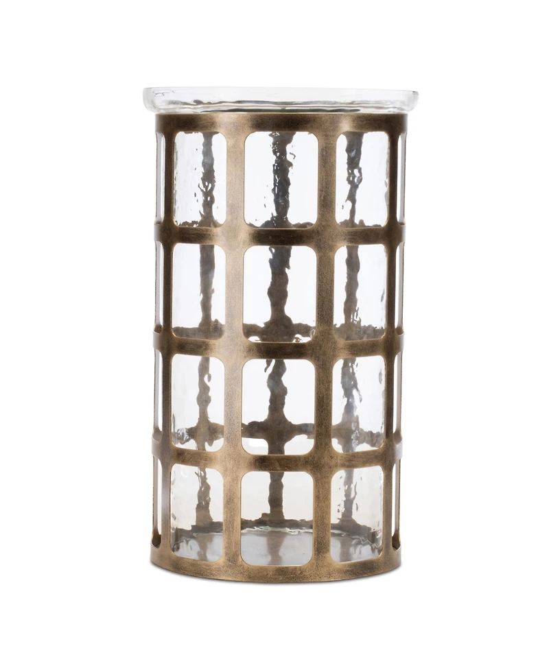 Add a touch of chic style to your home with this Wavy Glass Candle Holder. Measuring 12.5" tall, this piece is a great fit for your contemporary or modern style of home decor. The abstract wavy glass hurricane paired with the distressed gold metal frame is the perfect combination to create a stunning display. The quality glass and iron metal composition is sure to endure for seasons to come. Illuminate the display by adding a real wax or Led candle to the holder. Candles sold separately, this piece best fits a 4" or 5" pillar candle.