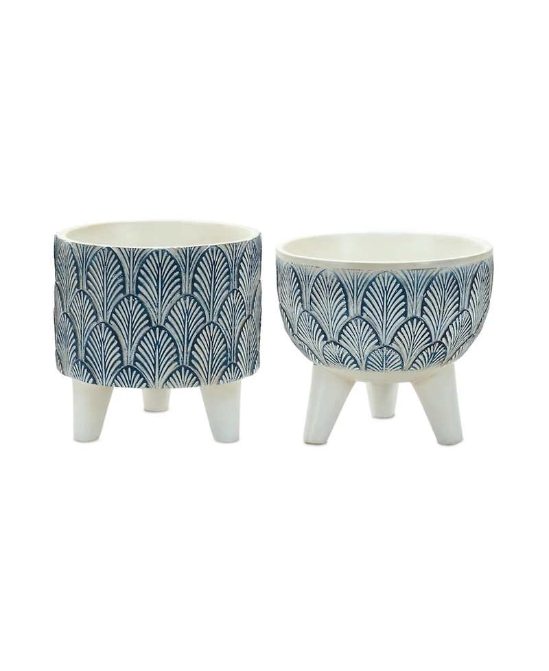 Display your plants in style with this chic set of Decorative Mini Pots with legs. Featuring two assorted designs, the geometric painted patterns paired with the cool blue and white color scheme makes this set a great addition to your everyday home decor. The quality poly resin composition and glaze finish is sure to last for seasons to come. Complete the look by dropping in a faux potted plant or succulent.