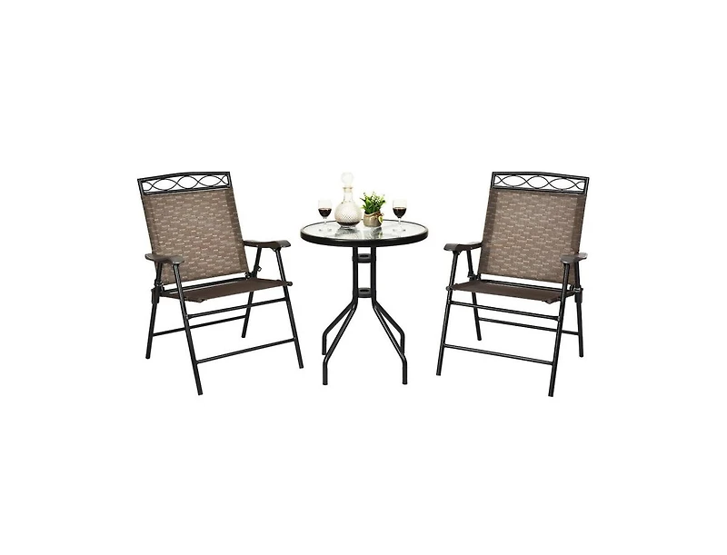 3 Pieces Bistro Conversation Set: A comfortable relaxing area is made up with 2 folding chairs and a round tempered glass table to conduct a private conversation or have dinner with best friends. It's easy to change your outdoor furniture layouts for an optimal new look to get the mood strikes. Perfect for your living room, backyard, beside pool or garden.