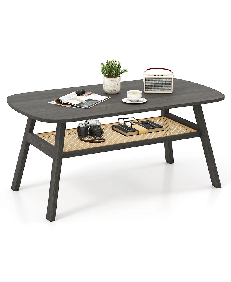 Add a stylish and functional touch to your living space with this rectangular coffee table, featuring a modern 2-tier design in a sleek grey finish. The spacious tabletop provides ample room for drinks, decor, and everyday essentials, while the lower rattan shelf offers convenient storage and a textured accent. Supported by sturdy rubber wood legs, this table ensures durability and stability for long-term use. Blending contemporary design with a hint of rustic charm, it s a versatile centerpiece that complements a variety of interior styles.
