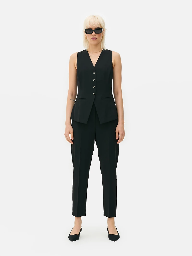 High-waisted slim pants with tapered legs, an ankle-length cut, and side pockets