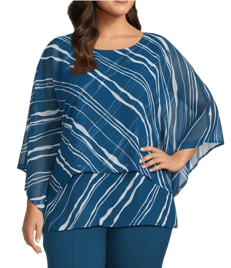 Slim Factor by Investments Plus Size Stripe Chiffon 3/4 Sleeve Crew Neck Double Layer Top