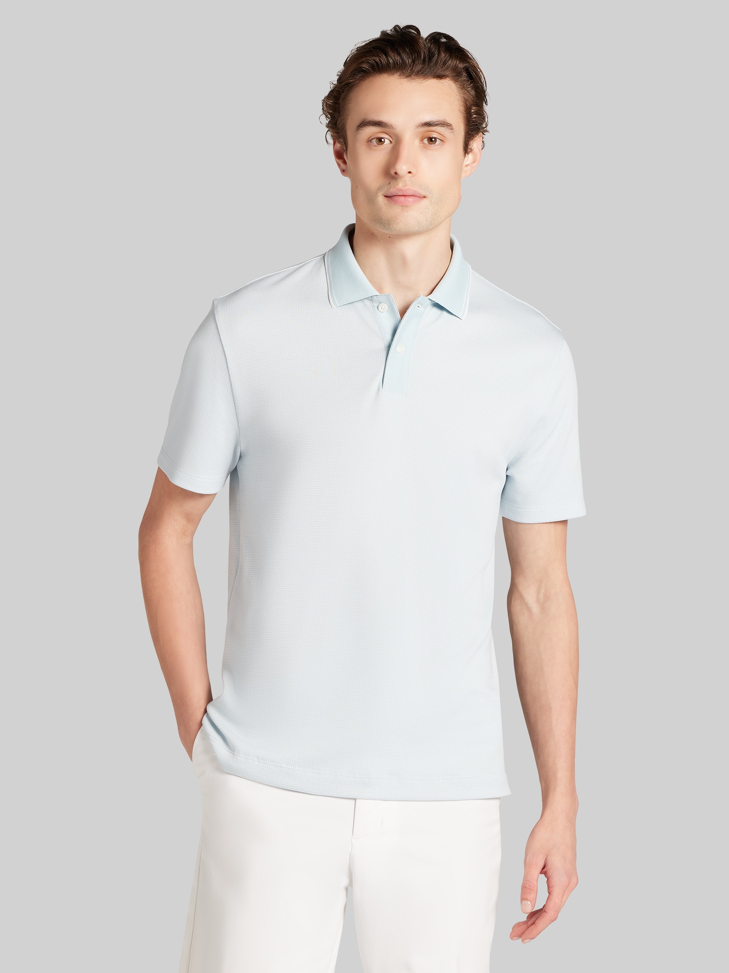Elevate your smart-casual look with the Awearness Kenneth Cole Grid Jacquard Polo. This isn't just a standard polo; it features a sophisticated grid jacquard knit, introducing subtle texture and depth to the fabric for a refined, modern appearance. Tailored for a comfortable yet sharp fit, this shirt delivers the breathability and ease of a polo while maintaining a polished aesthetic. Perfect for the office, a weekend outing, or anywhere you need an elevated casual style, the Grid Jacquard Polo ensures you look distinguished with ease.