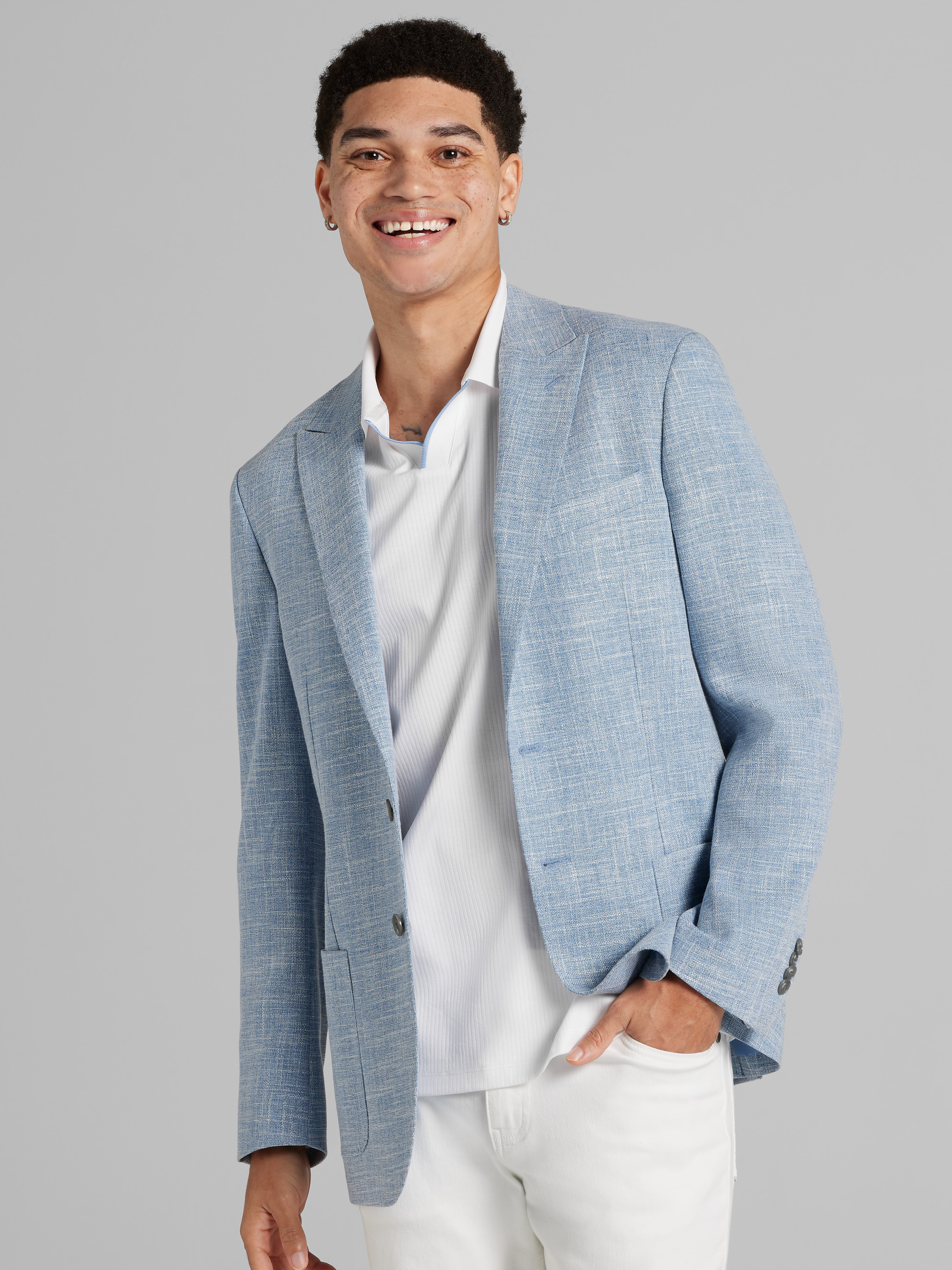 Because sometimes your usual blazer just doesnt make the cut. This slim-fit blue textured sport coat delivers business-casual with a side of confidence. Its sharp, single-breasted design and peaked lapel say I'm ready for anything, while the textured fabric keeps things interesting. Perfect for date nights, homecoming, or whenever you want to give your look that extra impact. Dress up and own the room without trying too hard. After all, a great sport coat does most of the talking.