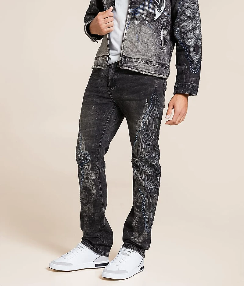 Slim fit jean Comfort stretch fabric Straight from knee to hem Mid-rise, 16" bottom opening Rhinestones and embroidery details Zip fly