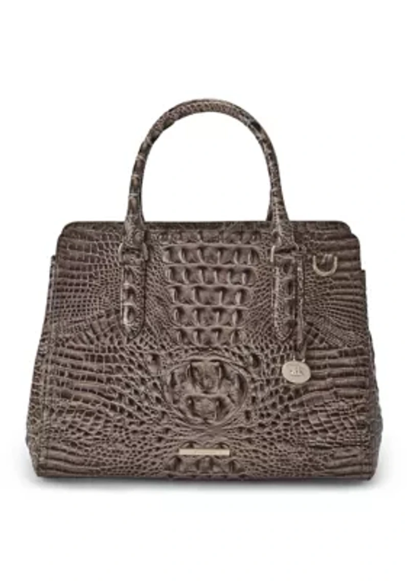 The Small Finley is a scaled-down version of Brahmin's classic Finley Carryall. She's a chic companion for day trips, date night and the occasional networking event. This compact satchel features multiple interior pockets and a back slide-in pocket to keep your essentials organized. Clip on the adjustable shoulder strap to go hands-free at a moment's notice. Zip top closure Rolled handles Center zip pocket divider Removable, adjustable strap Back slide-in pocket Two organizer pockets Interior zip pocket Jewelry pocket Key clip Footed bottom Dust bag included 5" handle drop 18'' strap drop Imported Product Specifications 15.2'' W x 10'' H x 5.5'' D Material & Care Leather Clean with a soft cloth