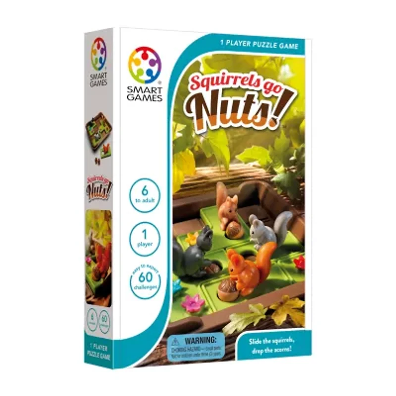 Winter is coming, so let's go nuts! Help the squirrels get ready for winter! Can you move the squirrels around and hide their acorns underground? Smart games squirrels go nuts! Is a sliding puzzle game with 60 nutty challenges to test your skills. Fun for kids and adults, squirrels go nuts! Comes with a portable game board and lid, making it perfect for on-the-go fun! To play, place the squirrels and acorns on the gameboard as shown in the challenge. Slide the squirrels horizontally and vertically around the gameboard so all acorns are dropped into holes. You have found a solution when all squirrels have dropped their acorn into a hole. Recommended for 1 player, ages 6 and up. Made in China. Package dimensions: 9. 500 x 7. 000 x 1. 750 inches. Includes 5 tiles, 5 acorns, game board with lid to easily store everything. Booklet with 60 challenges and solutions.