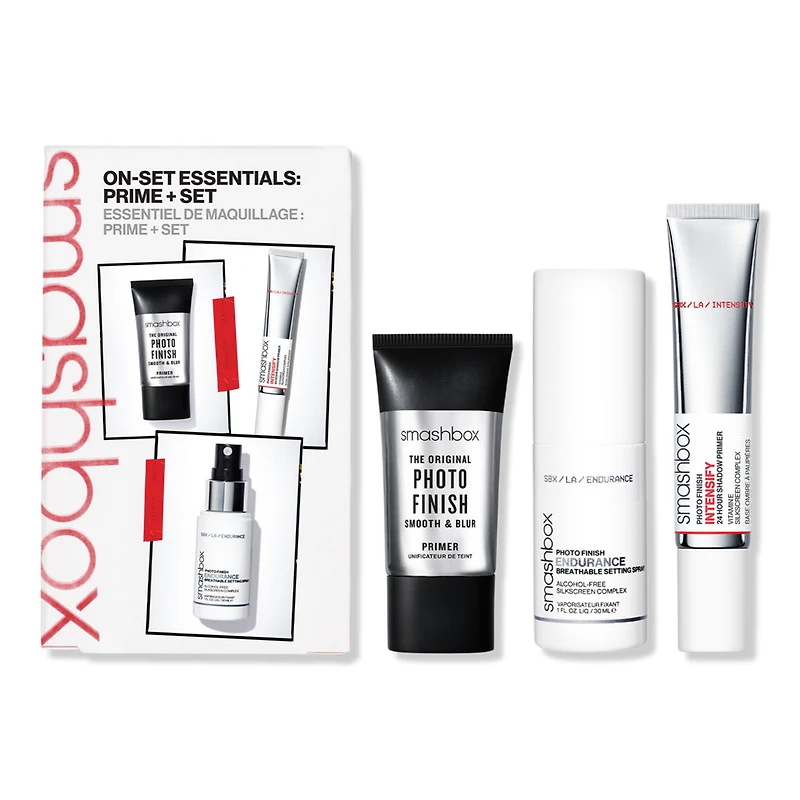 MINI PRIMER TRIO ON SET ESSENTIALS. Includes: Full-Size Photo Finish Intensify 24 Hour Shadow Primer (0.34 oz). Mini The Original Photo Finish Smooth & Blur Primer (0.34 oz). Mini Photo Finish Endurance Breathable Setting Spray (1 oz). Benefits: Cruelty-free. Photo Finish Intensify 24 Hour Shadow Primer goes on clear, intensifies shadows color, and helps it stay put for up to 24 hours. Photo Finish Intensify 24 Hour Shadow Primer formula blends effortlessly and helps keep shadow transfer-resistant as well as fade, crease, and smudge-proof. The Original Photo Finish Smooth & Blur Primer instantly smooths and blurs the look of pores and fine lines while helping makeup last. The alcohol-free Photo Finish Endurance Breathable Setting Spray sets makeup for up to 12 hours and immediately hydrates skin for 16 hours. Photo Finish Endurance Spray is dermatologist tested and non-acnegenic: wont make you break out. Appropriate for all skin types. Paraben-free and Phthalate-free. In a consumer study on 103 women after 1 week of using Photo Finish Original Smooth & Blur Primer::. 93% said they saw blurred imperfections. 93% said they saw smoother skin. 91% said they saw a minimized appearance of pores and lines. Key Ingredients: A Silkscreen Complex - Hyaluronic Acid, Vitamin B5, Trehalose Sugar, and Probiotic Extract: Helps balance and strengthen skin (Setting Spray). A Silkscreen Complex - a blend of Antioxidants including Vitamin E: Strengthens skin against pollution and blue light (Shadow Primer). Patch Polymers: Help improve adhesion power (Shadow Primer).