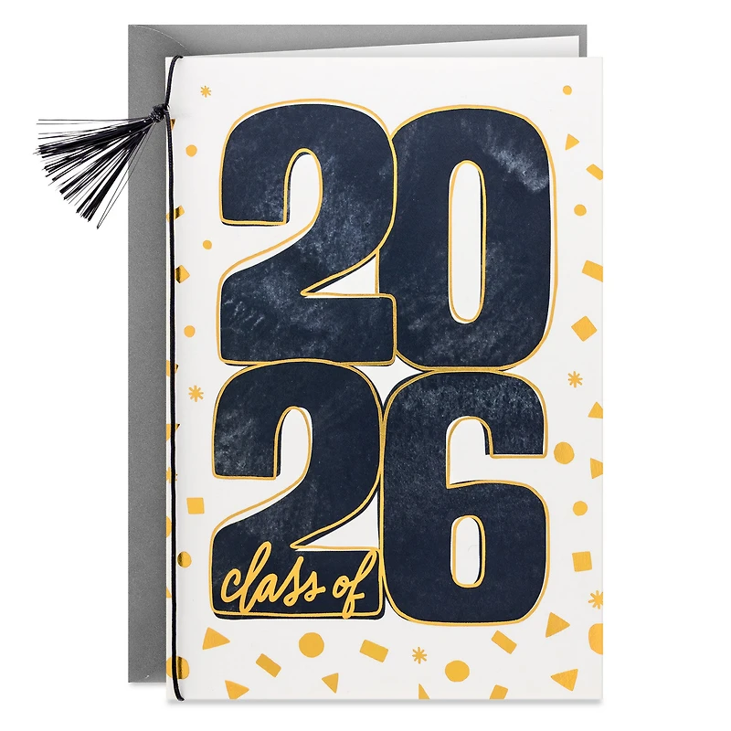 Class of 2026 graduation greeting card features black block numerals with gold laser foil details — including geometric confetti designs — paired with a black cord embellishment and message of pride in their accomplishment.