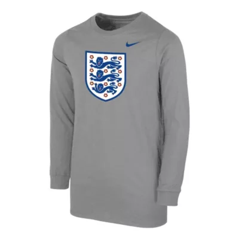 Your kiddo can leave no doubt that they are the ultimate England National Team fan with this Core T-shirt from Nike. It features iconic team graphics that emphasizes their unwavering loyalty. The plush cotton fabric is sure to keep them warm and snug every time they sport this England National Team top. Brand: Nike; Crew neck; Long sleeve; Machine wash, tumble dry low; Material: 80% Cotton/20% Polyester; Officially licensed; Rib-knit collar and cuffs; Screen print graphics. Imported Material & Care Polyester/Cotton Machine washable or hand wash for best results